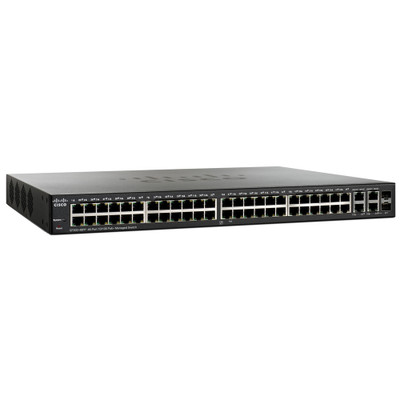 The Cisco SF300-48 switch has 48 Fast Ethernet ports and up to four gigabit Ethernet ports. This switch is manageable through a web-based interface, letting you configure settings and monitor performance. Advanced security features and performance enhancing technology in a cost-effective package make this switch ideal for small businesses.