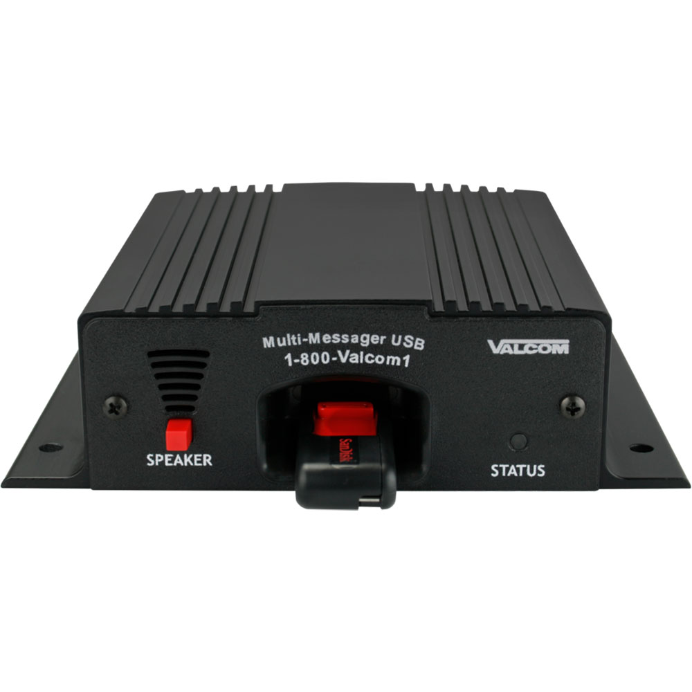 Valcom V-9989 is a device for storing messages to be played over a paging system. It is perfect for airports, manufacturing facilities, hospitals, theme parks, museums, and other locations where repeated messages are used. You can store up to 99 messages as MP3 files on a USB flash drive up to 4 GB in size. The messages can be played continuously, on a schedule via the device's built-in timer circuit, or triggered via an input. No drivers or special software are needed for operation.
