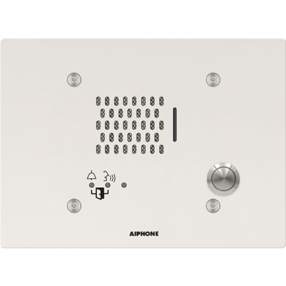 Aiphone IX-NVP is an audio-only IP intercom that's weather-resistant and ultra-simple to operate. IX-NVP works as a door phone and sub-station and is rated for indoor or outdoor installation. It has a single call button with clear indicator lights. Program the intercom to dial up to 20 extensions; select one of three call levels. You can customize the sound files that play during the user interaction to better indicate via audio that a call is being placed, the door is being released, and so on.