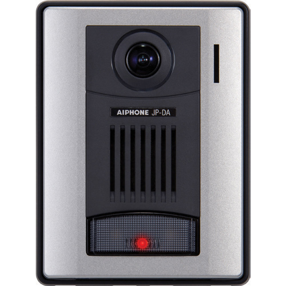Aiphone JP-DA is a surface mount door station for use in an Aiphone JP Series intercom system. The video door station has a single call button and a built-in wide-angle camera. The camera supports digital PTZ functionality, which the user can adjust from the master station that the door station is connected to. Its LED illumination light automatically turns on when light levels are low, helping users at nighttime.