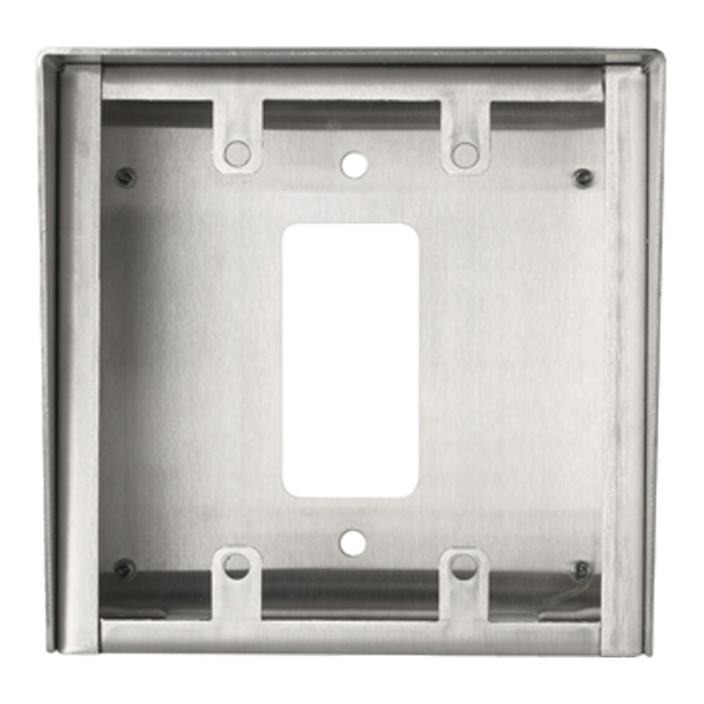 Aiphone SBX-2G/A is a stainless steel box for surface-mounting 2-gang Aiphone stations. The surface mount box is weather-resistant with ample space inside it for wiring. Mount SBX-2G/A to a standard 1-gang box or mount it directly on a wall.