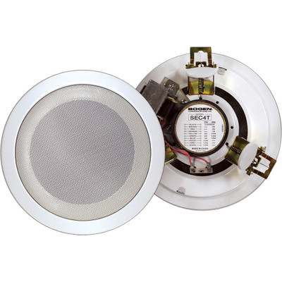 Bogen SEC4T is a compact analog paging speaker for installation in ceilings. SEC4T has a small footprint, measuring just over 7 inches in diameter, but still provides high-quality, room-filling sound with a 4-inch primary cone speaker and secondary high-frequency cone speaker. The analog speaker works with 25V and 70V paging systems. It has a 4W power rating and 4W transformer with six selectable power taps for adjust ing the volume. The grille is made from steel for long-term durability with a white enamel finish to make it look great. Mount SEC4T in a 6-inch hole in ceilings up to 1.25 inches thick, including directly in ceiling tiles. Spring-loaded clamps make installation ultra-fast and highly secure.