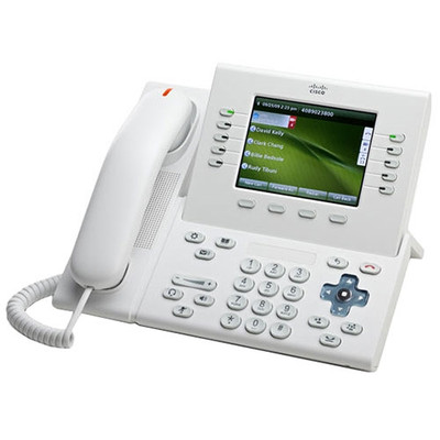 A charcoal finish and a standard handset outfit this Cisco 8961 VoIP phone. The built-in display lets you view media or easily access the phone's applications. Dual gigabit-speed Ethernet ports behind the phone quickly stream voice and data.