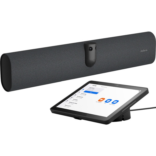 Get a Zoom Certified Jabra PanaCast 40 VBS, a video bar and touch controller bundle for small meeting rooms. PanaCast 40 uses dual 8 MP cameras to produce video with a 180° horizontal field of view for total room coverage. Designed for groups of 4 to 8 participants on the video call, it works for rooms up to 16-foot square in size. And it's much more than just ultra-wide-angle video. PanaCast 40 uses AI-enabled technologies like Intelligent Zoom, Intelligent Meeting Space, Multi-stream Dynamic Composition, Virtual Director, and more. These technologies provide a truly professional video conferencing experience using Zoom Rooms. It supports video resolution up to 4K Ultra HD, so you know everyone will look lifelike. And they'll sound great, too, because of audio-enhancing technologies like Non-Speech Noise Suppression. It has a built-in six-microphone array with a pickup range of up to 15 feet.