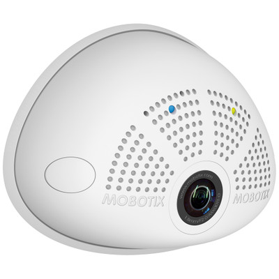 Mobotix i25 camera with an installed L12 lens. The lens provides a fisheye, 180-degree field of view. When mounted on a wall, the camera can provide complete coverage of the entire room or space. The camera discreetly blends into the environment and quietly provides you with full HD, color video. An integrated microphone can pick up VoIP audio, and the camera also supports event recording and other critical functions.