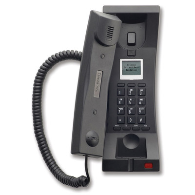 TeleMatrix is the industry standard for Hotel phones, and with the 3300TRM-IP they now offer their popular 3300 series trimline phones in VoIP. The phone features all standard features including hearing aid compliance, LCD display, and 2-10/100 Ethernet ports that can allow for guest Ethernet connectivity.