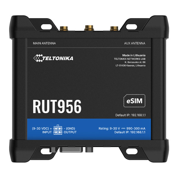 Teltonika RUT956 is an industrial router for IoT applications that brings together cellular, Wi-Fi, and wired Ethernet network connectivity. It provides automatic WAN failover, plus GNSS capabilities. RUT956 has two SIM card slots and supports up to 7 eSIM profiles. RUT956 also has serial communication interfaces for integrating a variety of devices into the network ecosystem.