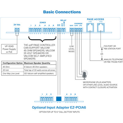 Valcom EZ-PC6 is a hybrid page controller that enables the integration of legacy analog paging systems with modern IP paging systems. EZ-PC6 is part of the Valcom ezIP Series. It supports paging from both analog sources like FXS and PABX station extensions, as well as IP sources using SIP. It supports multicast IP paging while at the same time supporting line-level output to analog endpoints. The page controller works with 45-Ohm, 25 V, and Valcom self-amplified speakers.
