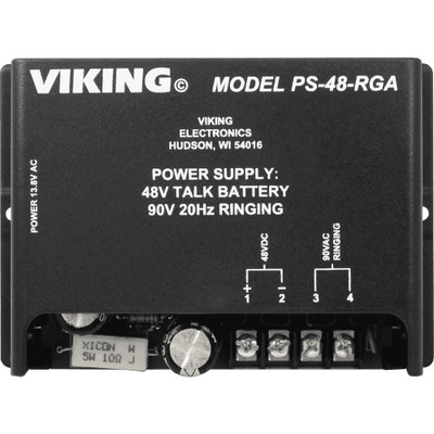 Viking PS-48-RGA is a wall-mount power supply that provides talk battery and standard ring voltage. It produces 48V DC talk battery for communications equipment and 90V 20 Hz sine wave ring voltage, which lets a single PS-48-RGA ring up to 30 phones in sequence.